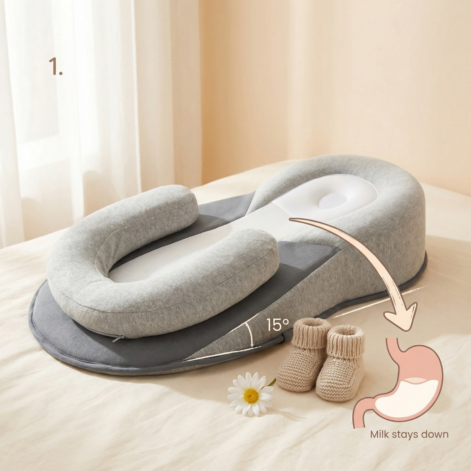 The gentle 15° incline uses gravity to keep milk in the stomach — so baby stays comfortable, calm, and settled after every single feed.